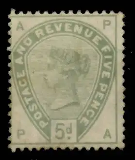5P dunkelgraugrün aus der Ausgabe Königin Viktoria, teilweise ohne Gummierung
