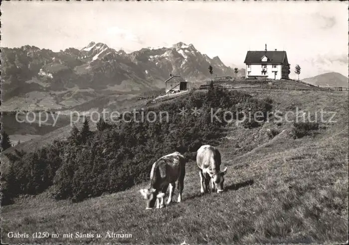 Gaebris Gasthaus Almweide Kuehe Blick zum Saentis und Altmann Appenzeller Alpen Gaebris postalisch gelaufen 1952 Erhaltung siehe scans Alte Ansichtskarte Postkarte hz Fhwoer