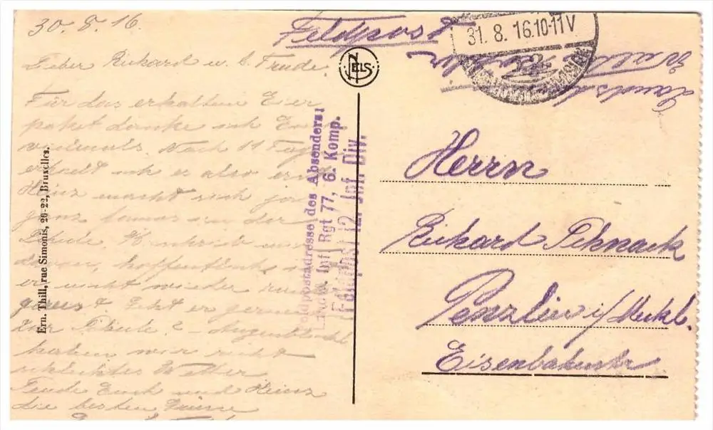 Gand / Gent , 1916 , Chateau des Comtes , Feldpost , Landwehr Inf. Rgt 77 , 6.-Kompanie , 12 Inf. Division !!!