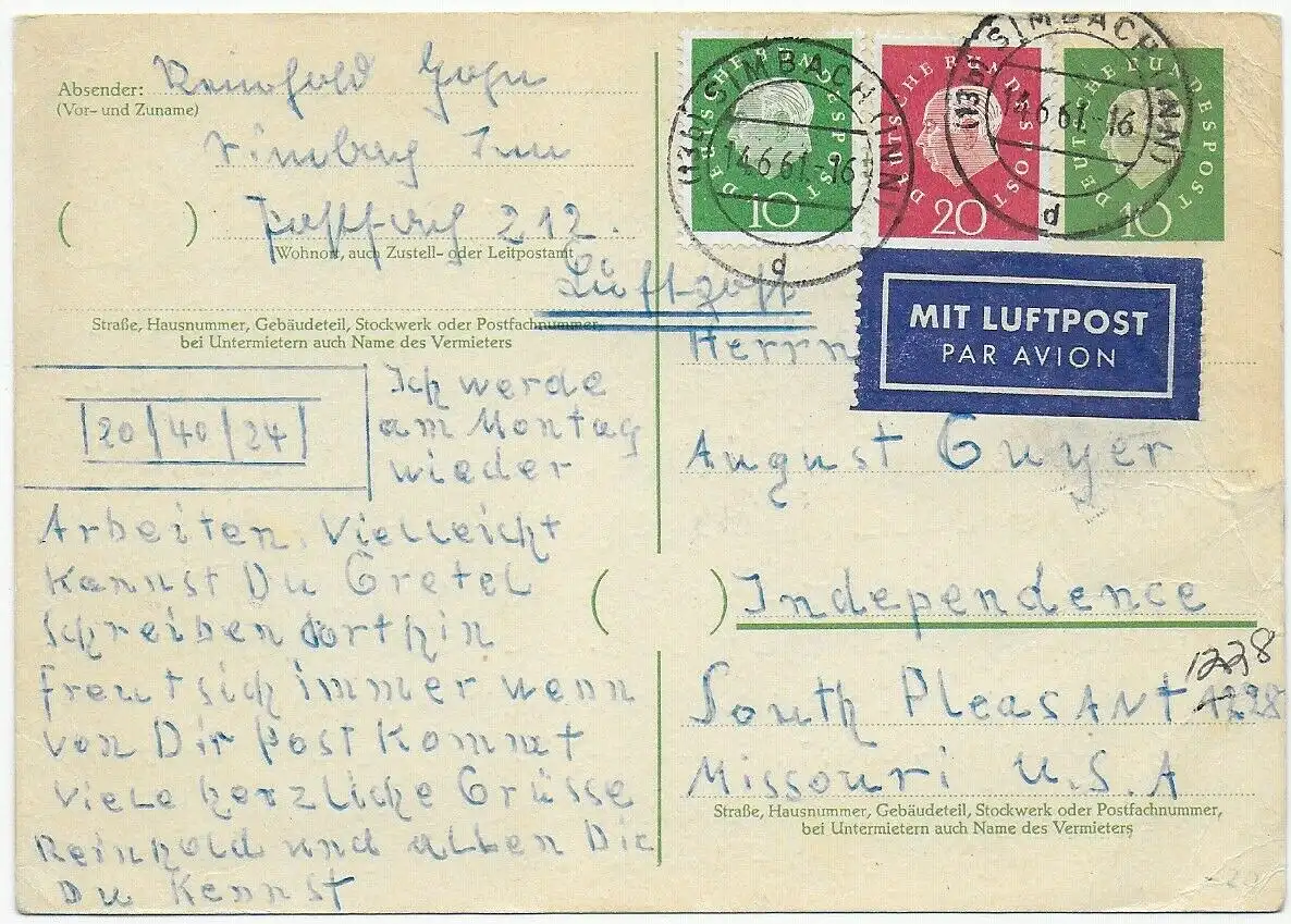 Ganzsache 1961 von Simbach nach Independence/Miss. USA