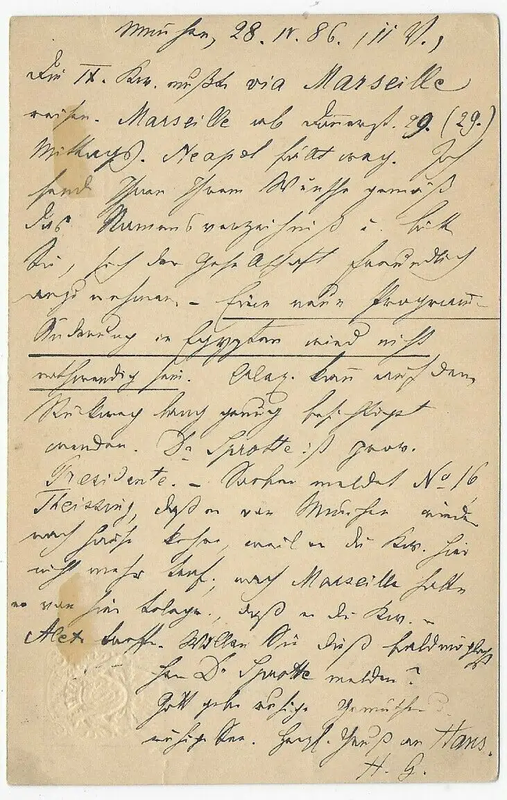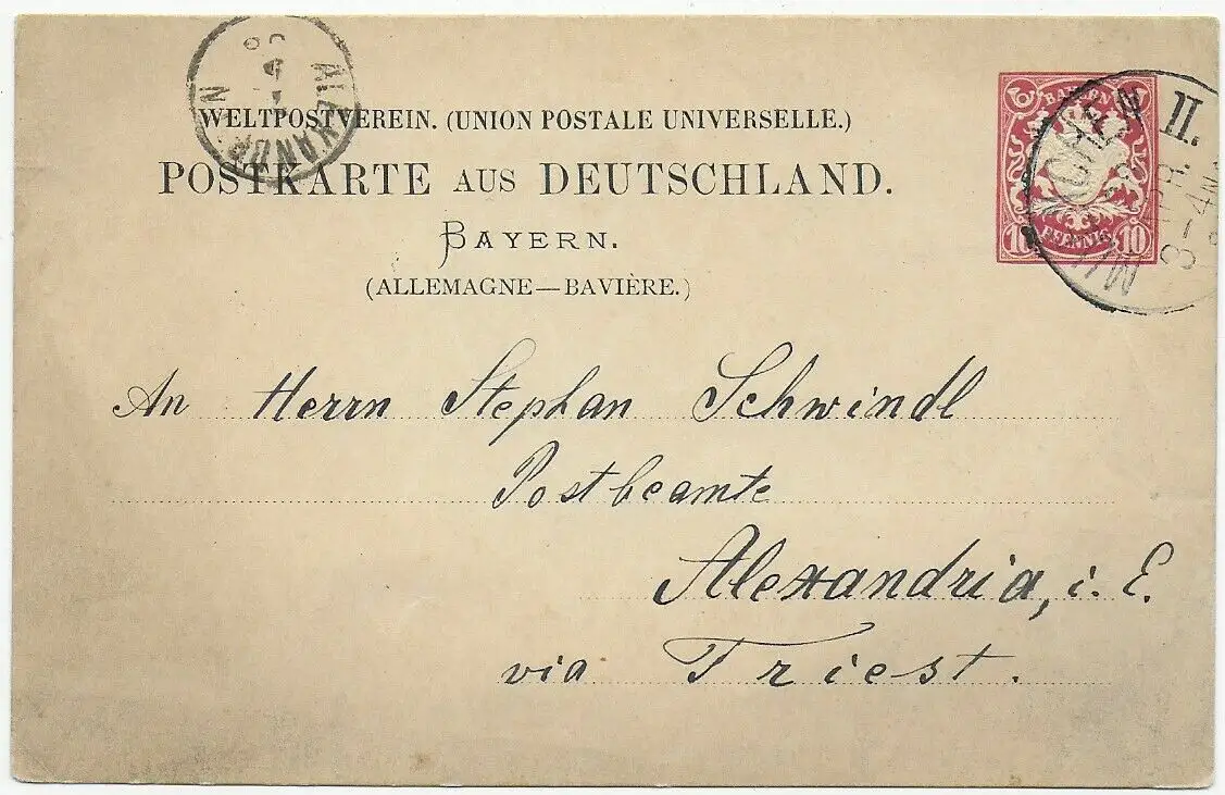 Ganzsache München II an einen Postbeamten in Alexandria via Triest 1886