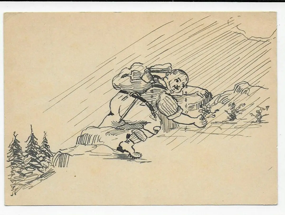 Ganzsache mit rückseitiger handgemalter Zeichnung: Wanderer findet Edelweiß