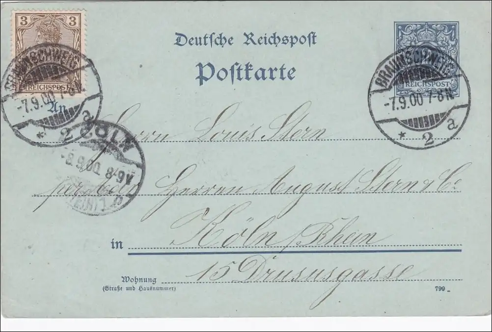 Ganzsache von Braunschweig nach Köln 1900
