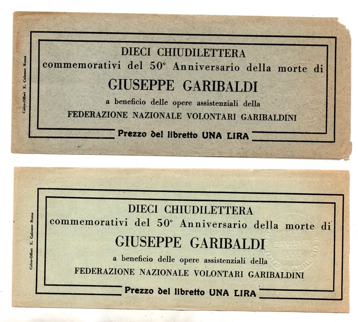 Garibaldi - Zwei Hefte mit zehn Gedenk-Erinnophilen zugunsten der Freiwilligen Garibaldini - Farben Grün und Schiefer - perfekt mit Vollgummi Cod.57/182