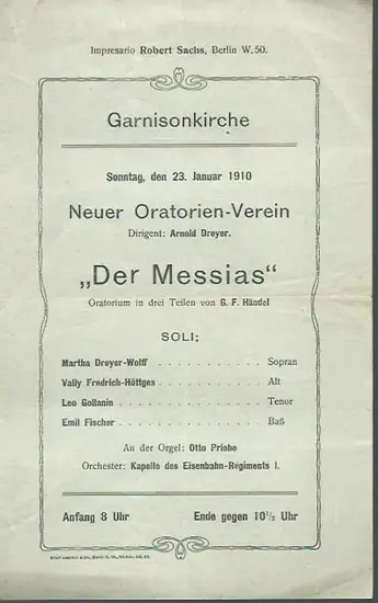 Titel: Programmzettel zum Konzert am 23. Januar 1910 in der Garnisonkirche, Berlin. Aufführung: G. F. Händel 'Der Messias' mit den Gesangssolisten Martha Dreyer-Wolff, Vally Fredrich -Höttges, Leo Gollanin, Emil Fischer und dem Neuen Oratorien-Verein. Dirigent: Arnold Dreyer. Orgel: Otto Priebe. Orchester: Kapelle des Eisenbahn-Regiments I
