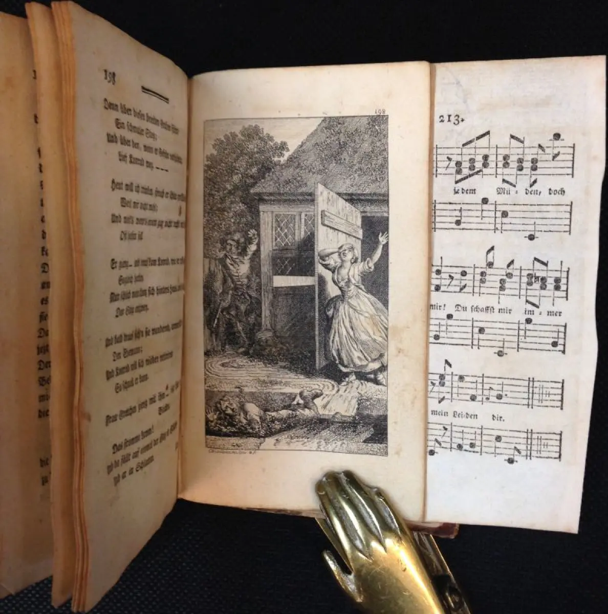 Göttingen, Dieterich 1778, 2 Bll., 290 S. Mit 4 Kupfertafeln von Chodowiecki u. 5 gefalt. Notenbeilagen. Kl.-8°, HLdr. d. Z. mit Rückenvergold. u. goldgepr. Rückentitel.