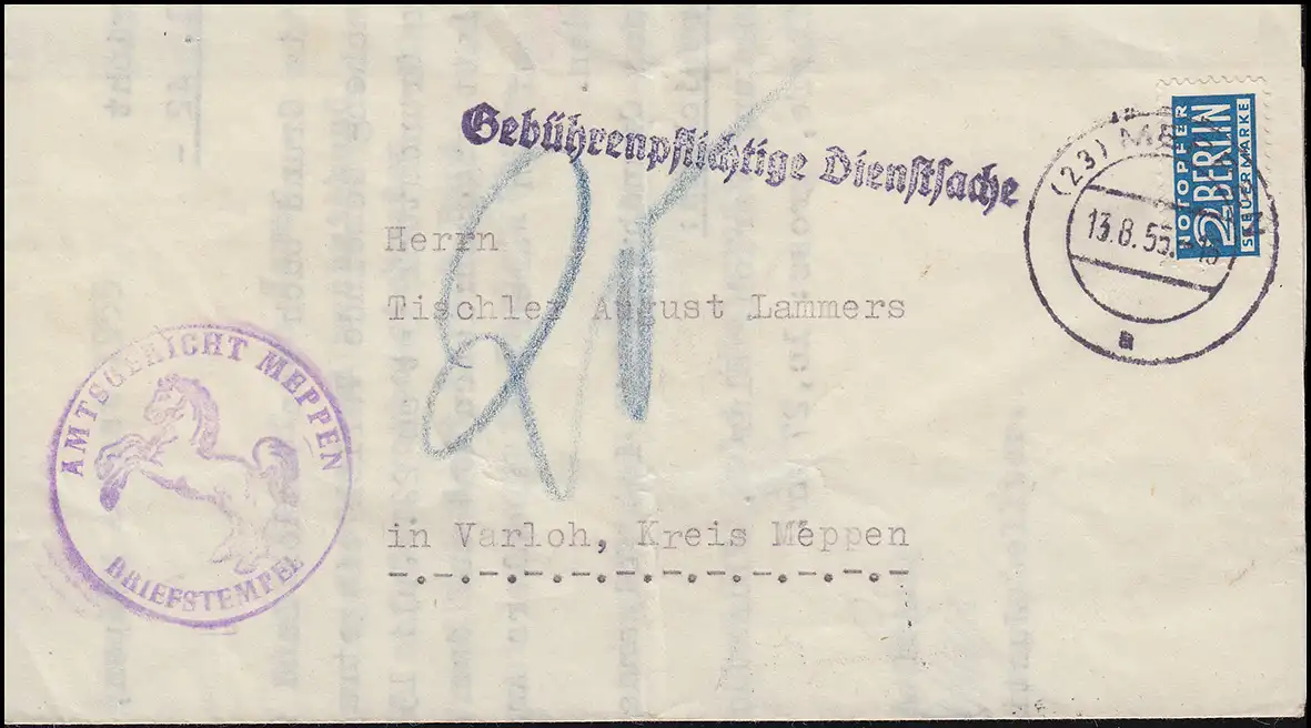 Gebührenpflichtige Dienstsache mit Notopfer Amtsgericht MEPPEN 13.8.55 n. Varloh