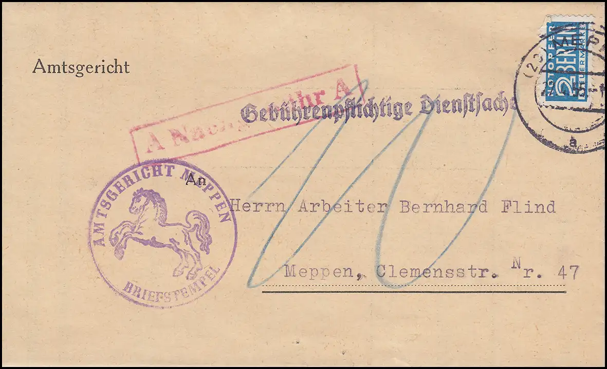 Gebührenpflichtige Dienstsache mit Notopfer Orts-Bf. Amtsgericht MEPPEN 27.4.55