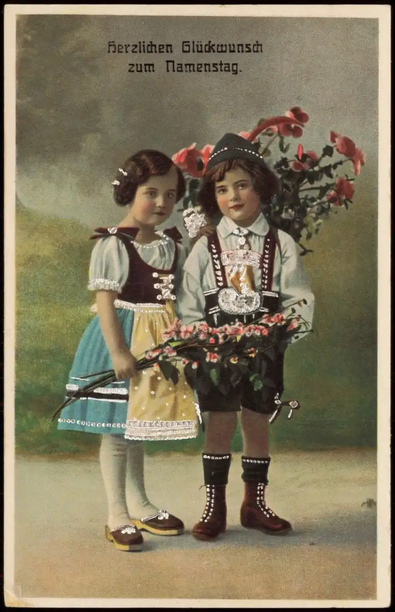Geburtstag Birthday Junge und Mädchen in Tracht 1918 Silberrand