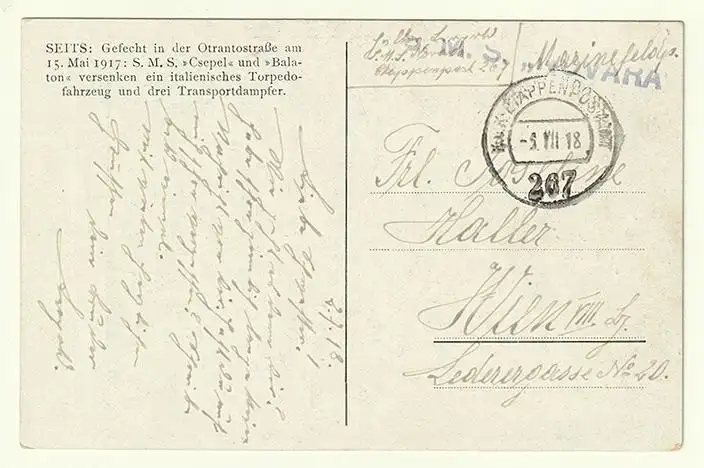 Bemerkungen: Gelaufen m. Stempel: S. M. S. "Novara" Einzeiler blau - KALIS 3-P.20 neben K. u. K. EPA/5. VII. 18/267 (Albanien-XIX. Korps-Kommando).