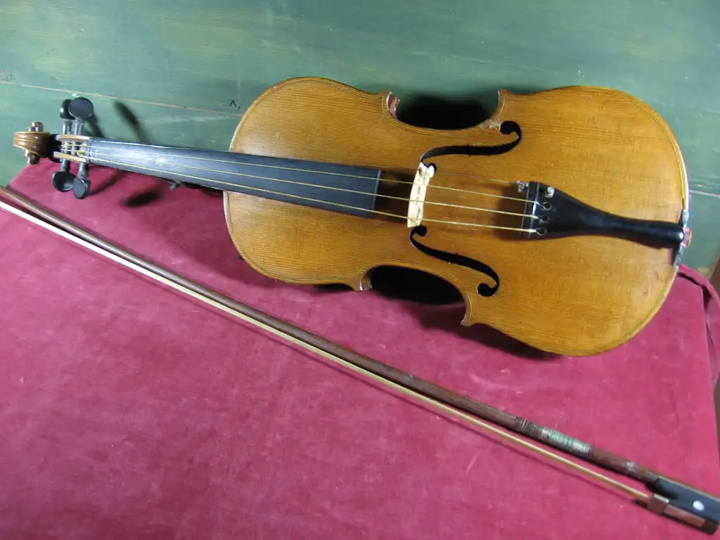 Alte Geige, Hersteller unbekannt. Geigenbogen mit kleinen Perlmutteinlagen.