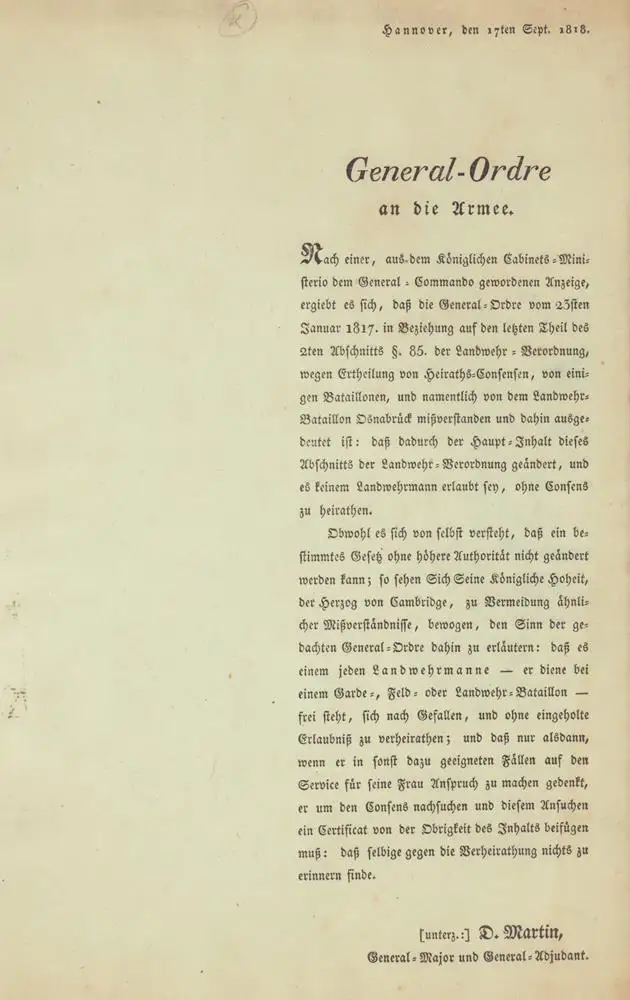 Titel: General-Ordre an die Armee. Im Druck unterzeichnet von D. Martin, General-Major u. General-Adjutant, Hannover, den 17ten Sept. 1818