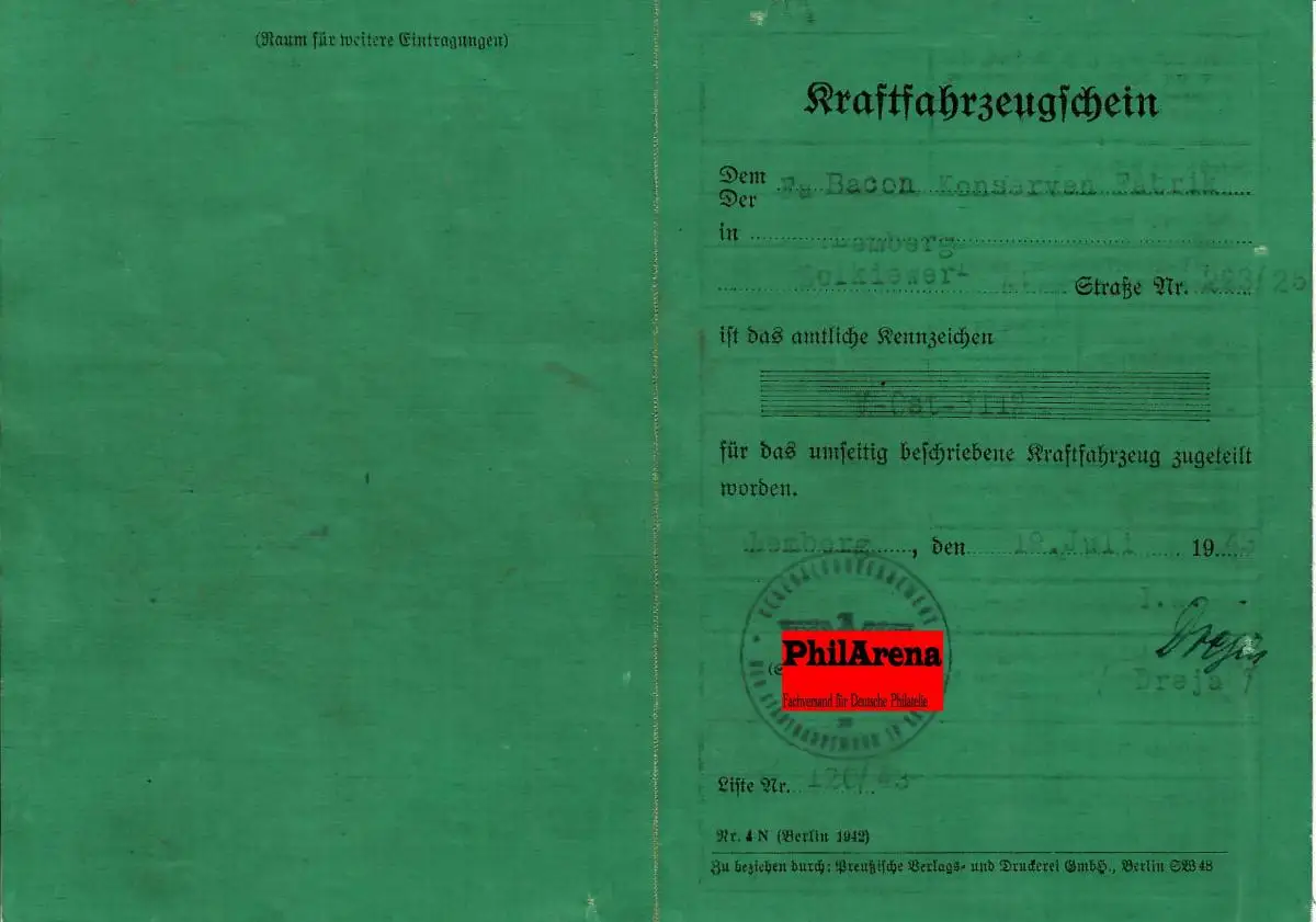 Kraftfahrzeugschein für die Konserven Fabrik Bacon in Lemberg. Ein Fahrzeug der Daimler-Benz Werke. Zuteilung der Kfz-Nummer V-Ost. Zusätzlich 9 Zloty der seltenen Gebührenmarken.
