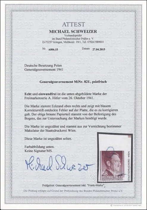 Generalgouvernement, MiNr. 82U, seltene ungezähnte Marke mit BPP Fotoattest !!!! ECKRAND !!!! blauer Korrekturstift der Staatsdruckerei Wien. Dies ist Makulatur, die bearbeitet wurde. Marke ist rückseitig Postfrisch, im Rand leichte Büge. Diese Marke gab es nicht mit perfekter Gummierung, die diese Marke nie zur Zähnung vorbereitet war sondern bearbeitet wurde und vernichtet werden sollte.