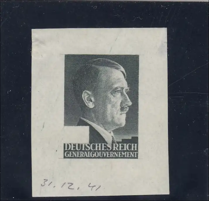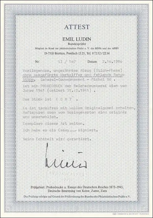 Generalgouvernement (GG) Probedruck ungezähnt ohne Wertziffer im Kleinbogen. Mit BPP Attest. Auf Wunsch, gegen Aufpreis, mit neuem BPP Fotoattest.