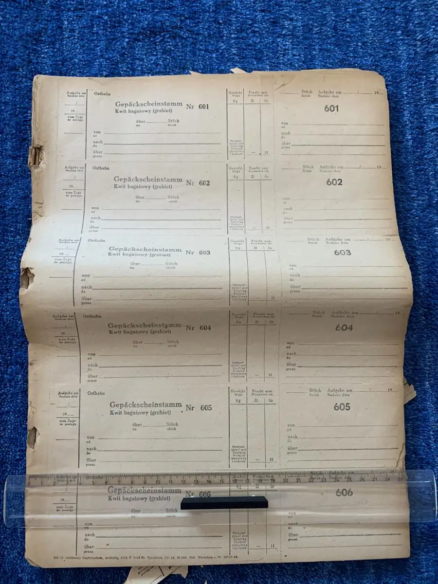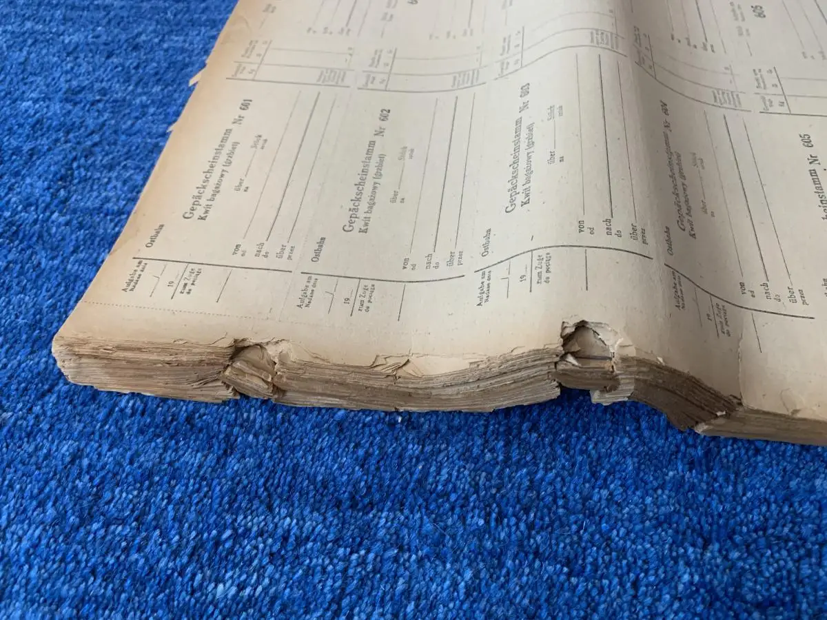 Großes Formular mit Abrißmöglichkeit für die Gepäckscheine. Dieses Formular ist vielfach da. Aufgrund der Größe (A3) ist es mittig gefaltet und unten ausgerissen (Alter). Es lassen sich aber viele (mehrere 100) vollständige Gepäckscheine daraus machen.