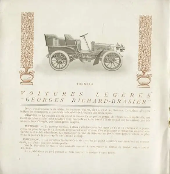 12 Seiten 16 x 15 cm Georges Richard Voiturettes: Tonneau, Doule Phaeton, Limousine, Coupé Georges Richard-Brasier: Voiture Serie L, Voiture de corse Serie L, Voiture de 8 chevaux Französischer Text Leichte Gebrauchsspuren