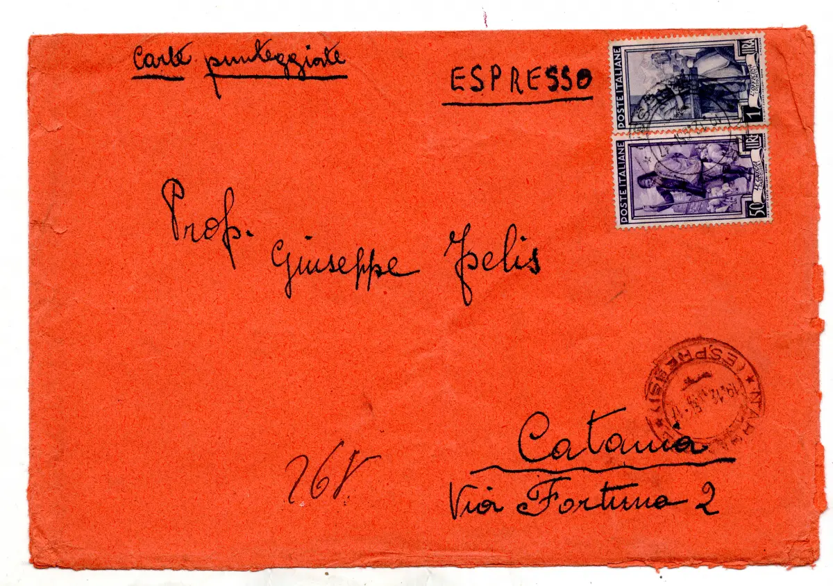 BEUTEL - Gepunktete Karten für Espresso - Umschlag, der am 19.12.51 von Narni nach Catania gereist ist, frankiert für 51 Lire mit Arbeit Lire 1 + 50 (Nr. 635, 647) - Umschlag von mittlerer Qualität, aber dennoch wertvoll für den Tarif Cod.413/182