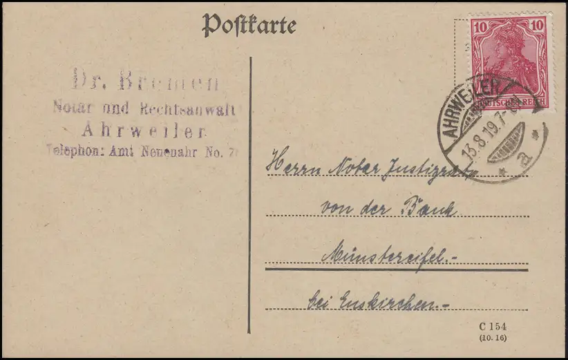 Germania 10 Pf EF Notar und Rechtsanwalt AHRWEILER 13.8.19 nach Münstereifel