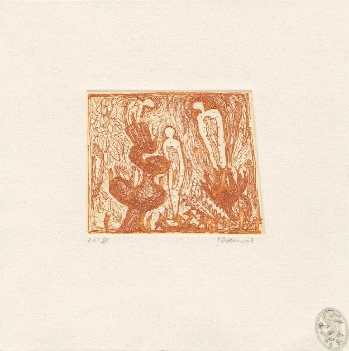 Bemerkungen: Gunter Damisch (1958-2016), österreichischer Maler und Plastiker. Er gehörte zu den Neuen Wilden. Im Jahr 1992 übernahm er eine Gastprofessur an der Wiener Akademie (Meisterklasse für Grafik) in Wien, seit 1998 war er dort Ordentlicher Professor. Er gehörte aufgrund seines unverwechselbaren, überzeugend und konsequent formulierten Farben- und Formenrepertoires zu den international bedeutendsten Vertretern österreichischer Gegenwartskunst. Die Radierung befindet sich lose in einem hs.signiertem Umschlag der Galerie Welz für Weihnachts- und Neujahrsglückwünsche m. 1 Blatt zum Lebenslauf Gunter Damischs.