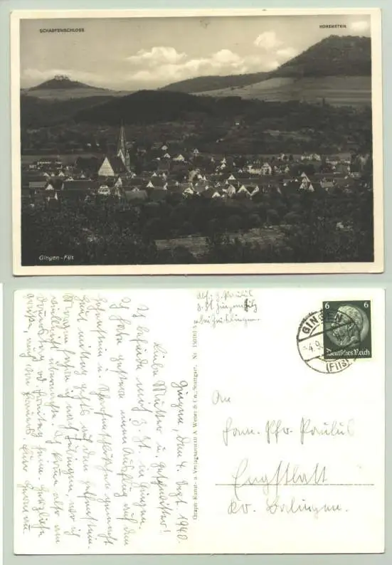 Gingen 1940 (intern : 1020573) Artikelbeschreibung u. Zustand : Siehe Scan. Weitere Infos : Alte Ansichtskarte : Gingen - Fils. PLZ-Bereich pauschal 73333. Postalisch gelaufen 1940