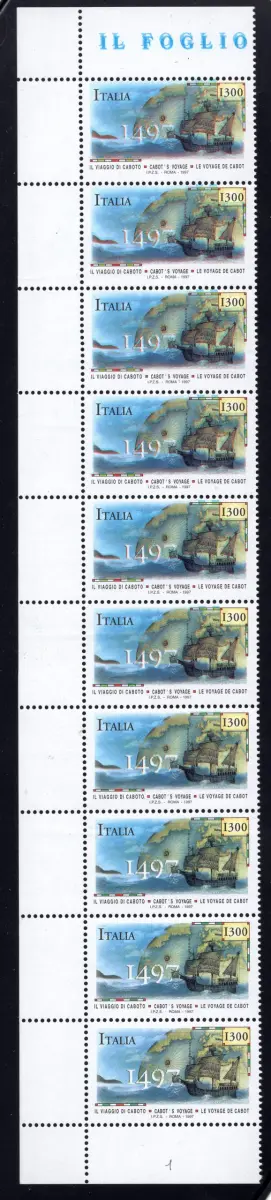 MNH Vollgummi - Giovanni Caboto Nr. 2299 vertikaler Streifen von zehn Exemplaren mit doppeltem Blaudruck - Deutlichste Sorte in den ersten fünf oberen Exemplaren - Wertvolle Sorte noch nicht katalogisiert - Zert. Manelli Cod. 781/182