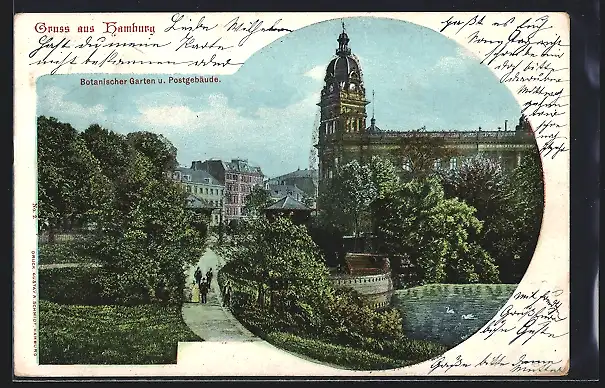 Glitzer-Perl-AK Hamburg, Botanischer Garten und Postgebäude im Sonnenschein mit Glitzer-Perlen