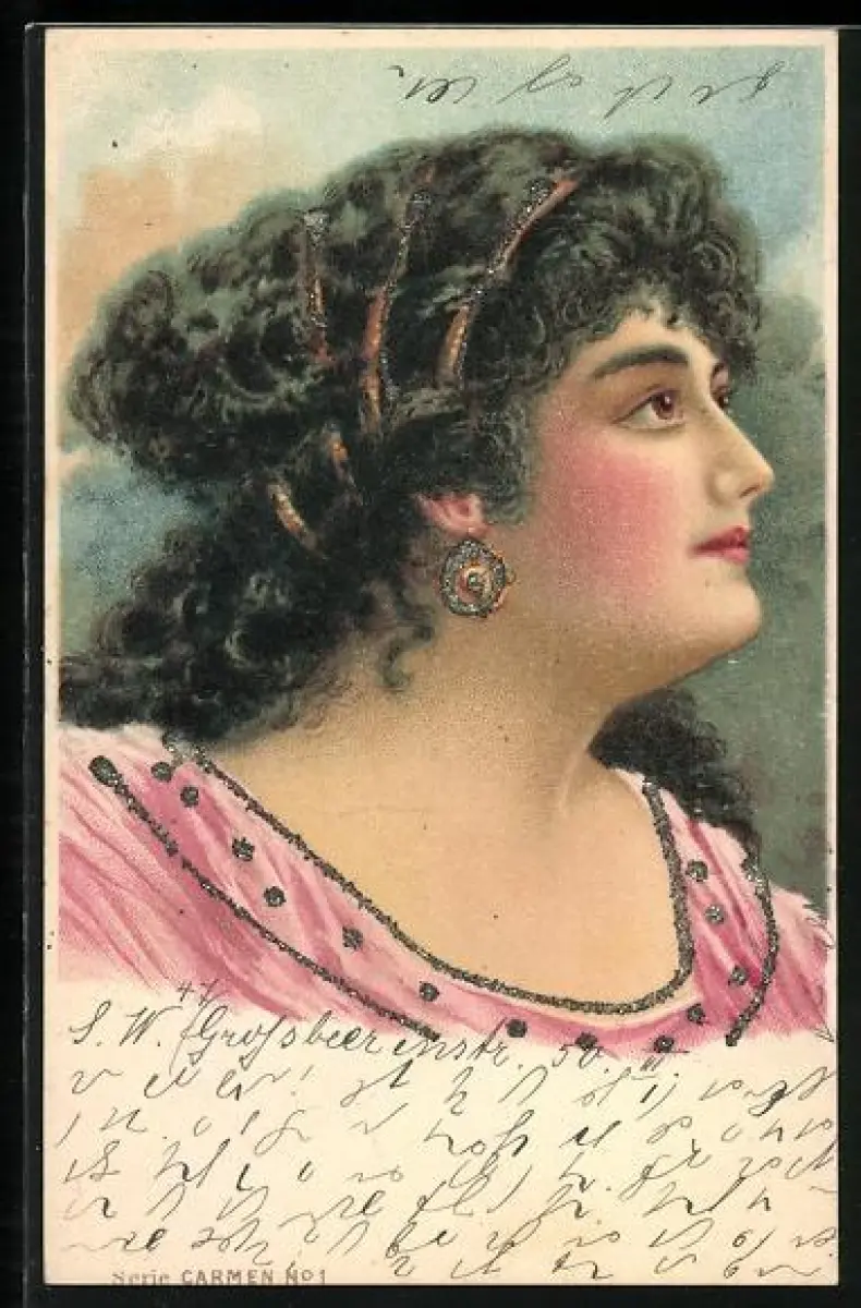 Glitzer-Perl-AK Junge Dame mit Ohrringen
