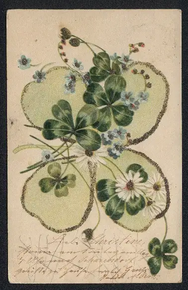 Glitzer-Perl-AK Klee mit Vergissmeinnicht und Margeriten