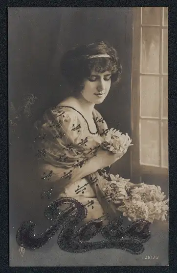 Glitzer-Perl-AK Schöne Frau mit Blumen, Name Rosa mit Glitzer-Perlen