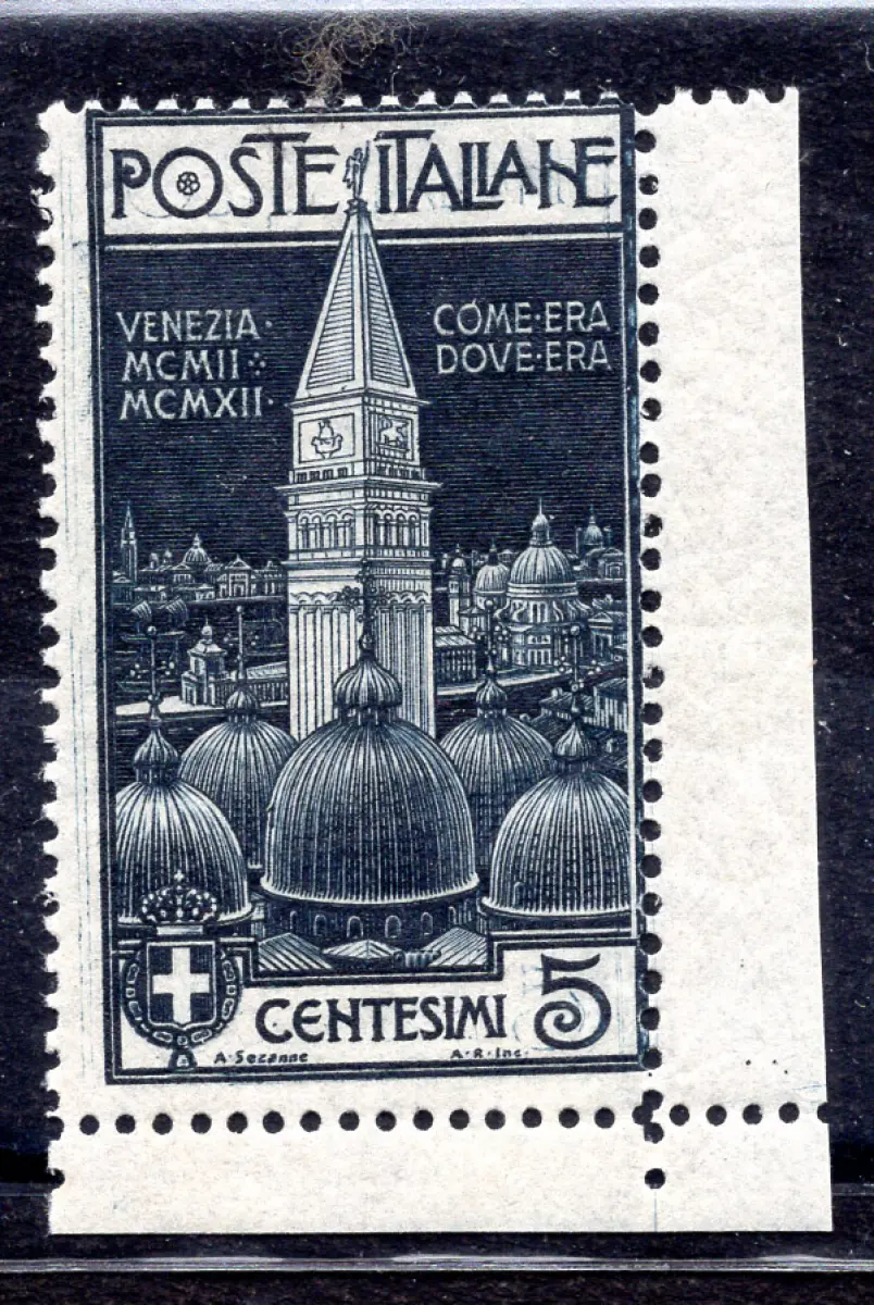 Glockenturm San Marco Cent. 5 Sorten Doppelgravur Vollgummi - Glockenturm San Marco Cent. 5 n. 97a schönes Exemplar a. von f. (Posiz. 100) Sorte Doppelgravur gut sichtbar auf Ziffer 5 rechts - Kat. euro 210 Code 233/11