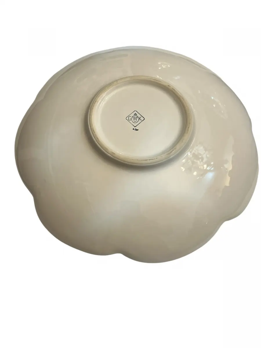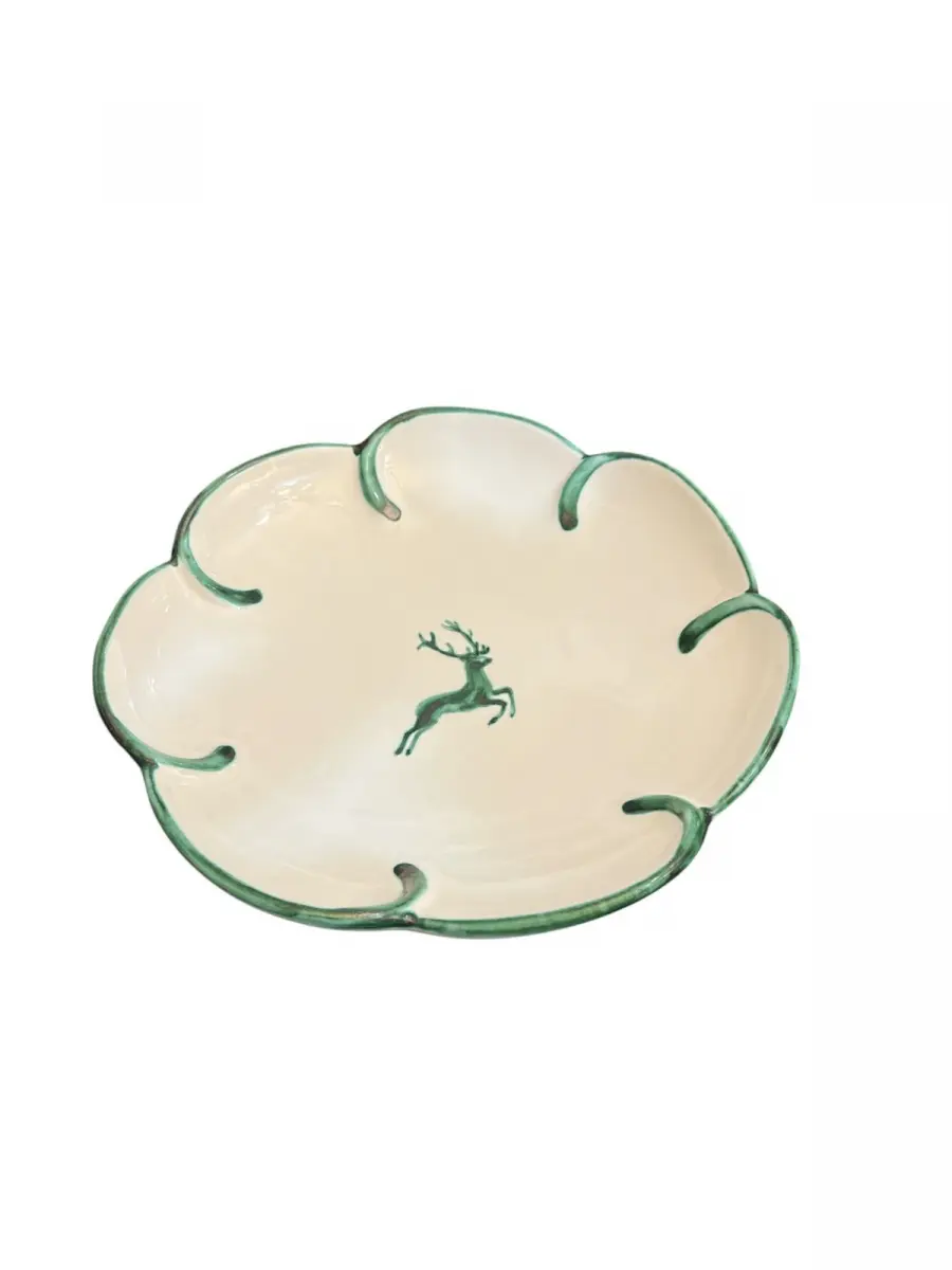 Gmundner Keramik Obstteller – Grüner Hirsch | Ø 27 cm Ein eleganter Klassiker aus österreichischer Handwerkskunst: Dieser Obstteller von Gmundner Keramik besticht durch sein cremeweißes Design mit grünem Rand und dem ikonischen springenden Hirschmotiv in der Mitte. Die geschwungene Tellerform mit sanft gewelltem Rand verleiht dem Stück eine besondere Note – ideal für festliche Tafeln oder als stilvolles Sammlerstück. Produktdetails: ✅ Marke: Gmundner Keramik ✅ Modell: Grüner Hirsch ✅ Material: Hochwertige Keramik ✅ Farbe: Cremeweiß mit grünem Dekor ✅ Durchmesser: ca. 27 cm ✅ Höhe: ca. 6 cm ✅ Zustand: Gebraucht, sehr gut erhalten ✅ Stil: Landhaus / Vintage ✅ Besonderheiten: Handgefertigt, bemalt, original aus Österreich Ein zeitloses Einzelstück für Liebhaber traditioneller Tischkultur oder als dekoratives Highlight für Ihre Küche oder Vitrine. .
