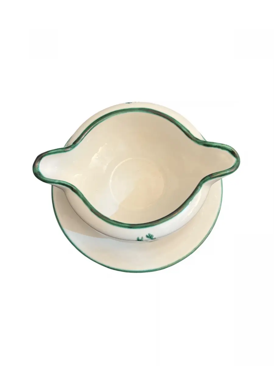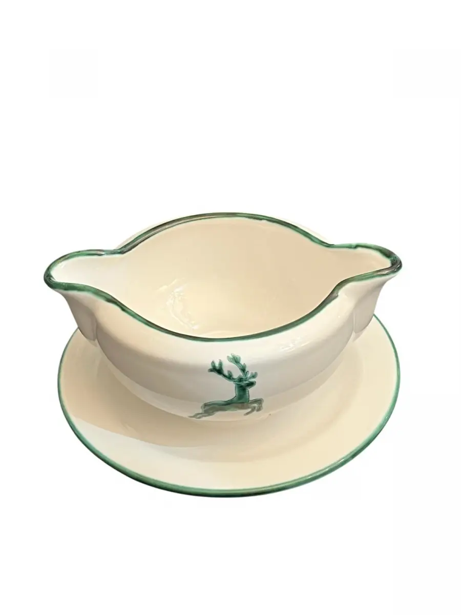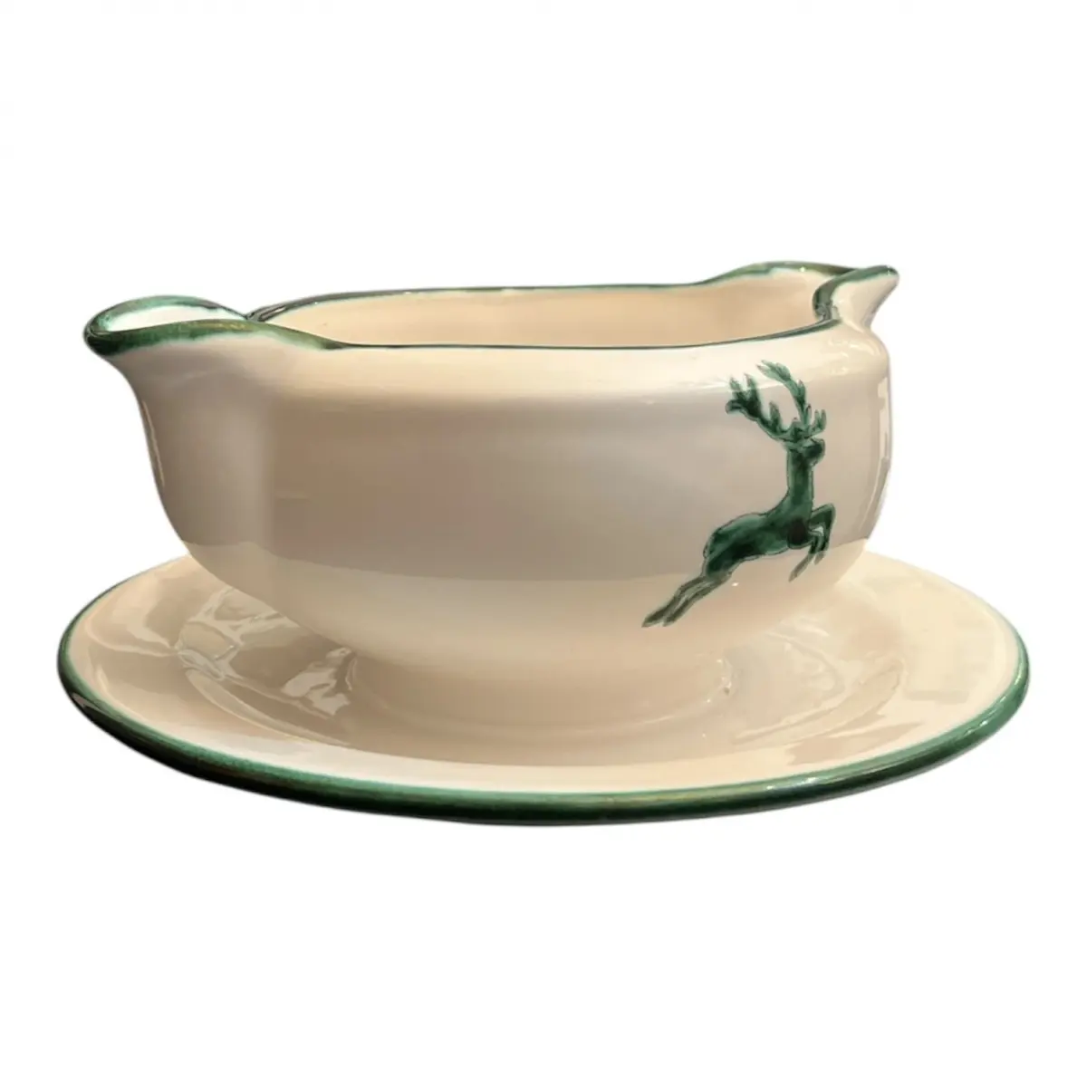Gmundner Keramik Sauciere mit Unterteller – Grüner Hirsch | ca. 28 cm Veredeln Sie Ihre Festtafel mit dieser eleganten Sauciere aus dem Hause Gmundner Keramik. Das klassische Design in Cremeweiß mit grünem Rand und dem ikonischen springenden Hirschmotiv verkörpert österreichische Handwerkskunst und zeitlose Ästhetik. Der fest verbundene Unterteller sorgt für Stabilität und schützt Ihre Tischdecke vor Tropfen – ideal für Bratensaucen, Jus oder feine Dressings. Produktdetails: ✅ Marke: Gmundner Keramik ✅ Modell: Grüner Hirsch ✅ Material: Hochwertige Keramik ✅ Farbe: Cremeweiß mit grünem Dekor ✅ Durchmesser: ca. 18 cm ✅ Zustand: Gebraucht, sehr gut erhalten ✅ Stil: Landhaus / Vintage ✅ Besonderheiten: Handgefertigt, bemalt, original aus Österreich Ein stilvolles Einzelstück für Sammler, Liebhaber österreichischer Tischkultur oder als festliches Highlight für Ihre Weihnachts- und Winterdekoration.