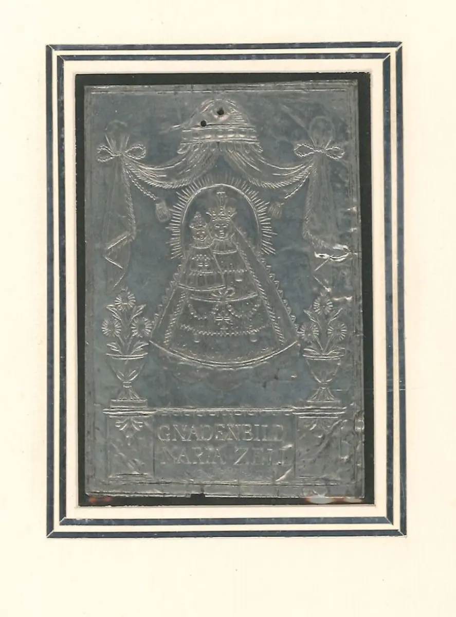 Bemerkungen: Reliefgeprägte Silberfolie, die das Mariazeller Gnadenbild `Magna Mater Austriae` unter einem Baldachin zeigt.