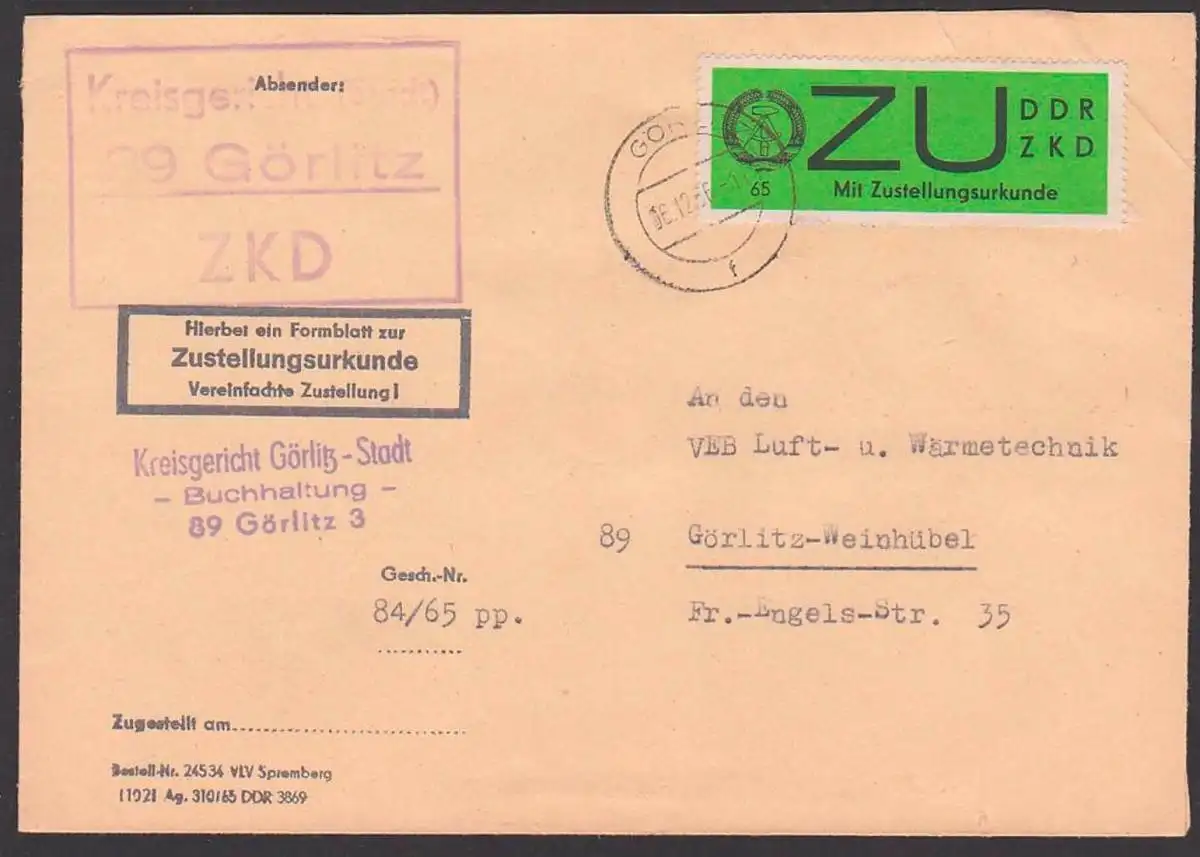 Görlitz 3, ZKD E2x Kastenstempel Kreisgericht Zustellungsurkunde Fernbrief Zentraler Kurierdienst Germany 6.12.66