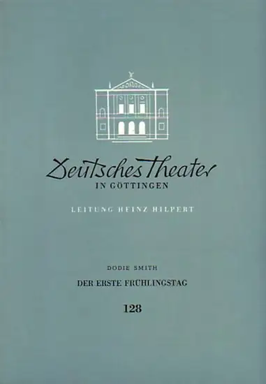 Titel: Der erste Frühlingstag. Programmheft für 1957 / 1958 (= Blätter des Deutschen Theaters in Göttingen VIII. Jahr Heft 128). Darsteller: Alwin Woesthoff, Hannelore Hinkel, Jöns Andersson, Lilian Westphal, Grete Wurm, Klaus Behrendt u.a. Regie: Eberhard Müller-Elmau, Bühnenbild: Jan Schlubach, Kostüme: Gudrun Fienbork. Weiterer Inhalt: J. Ringelnatz: Wie machen wir uns gegenseitig das Leben leichter, K. Capek: Die Premiere und der Autor, E. Penzoldt: Vom Entzücken, A. Polgar: Ein Antlitz, W. Foitzik: Familienausflug, J. Giraudox: Frühling, P. Ellmar: Dodie Smith und ihr Erster Frühlingstag, die Werke von D. Smith, Nach- und Hinweise