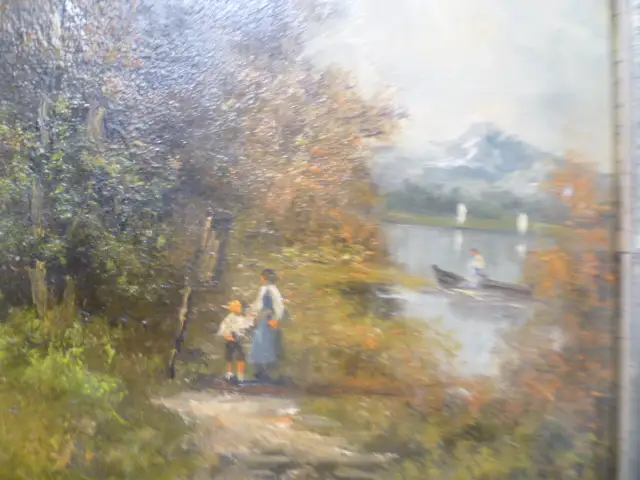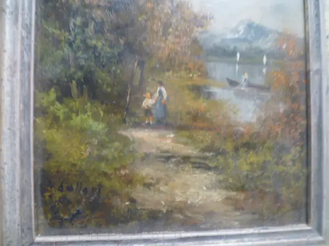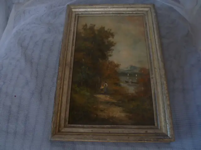 Gollert ? Italien oder Frankreich Maler des XIX MIniatur Gemälde Öl Holzplatte " Ideallandschaft mit Fischer auf dem See und Mutter mit Kind am Ufer Hintergrund Bergmassiv " " um 1870