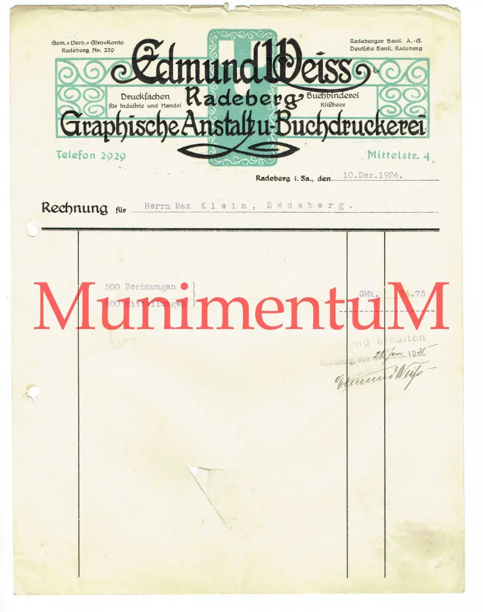 Graphische Anstalt & Buchdruckerei RADEBERG Edmund Weiß | Rechnung Offerte 1924