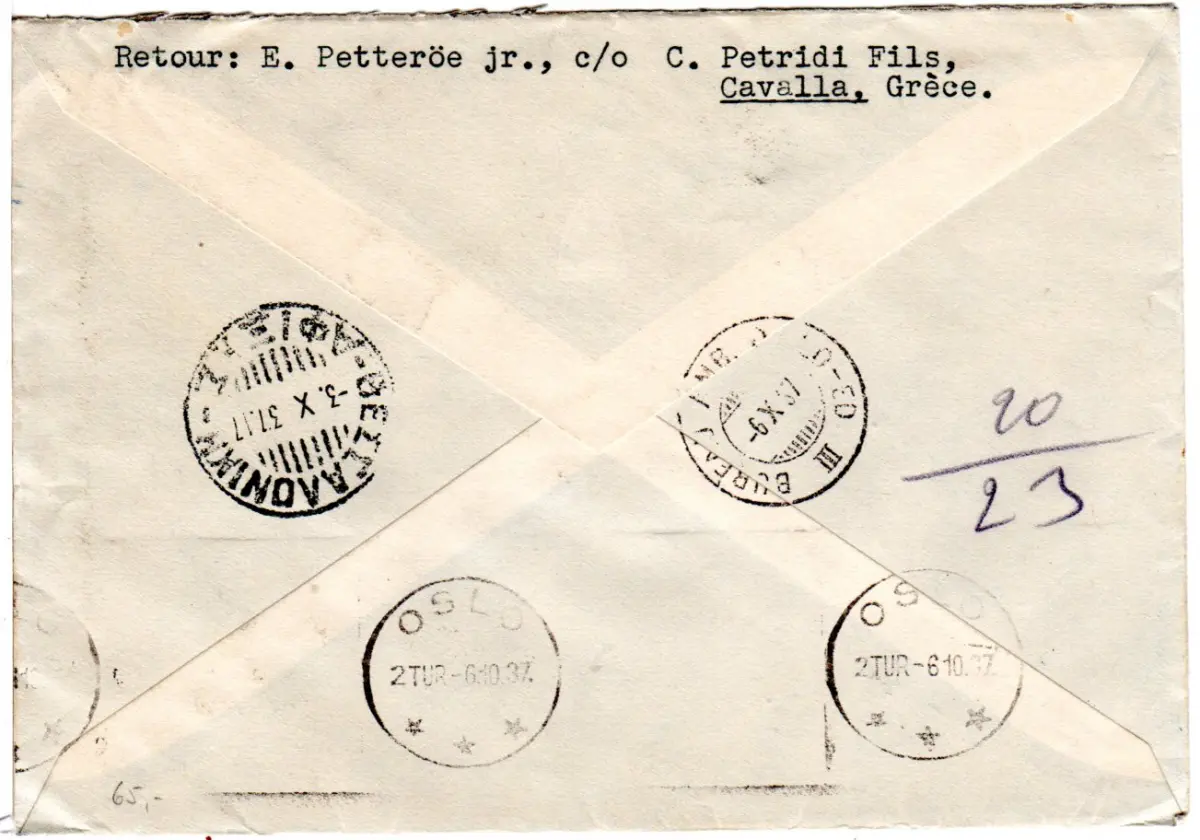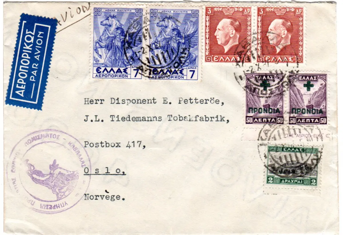 Griechenland 1937, 7 Marken auf Luftpost Brief v. Cavalla n. Norwegen.