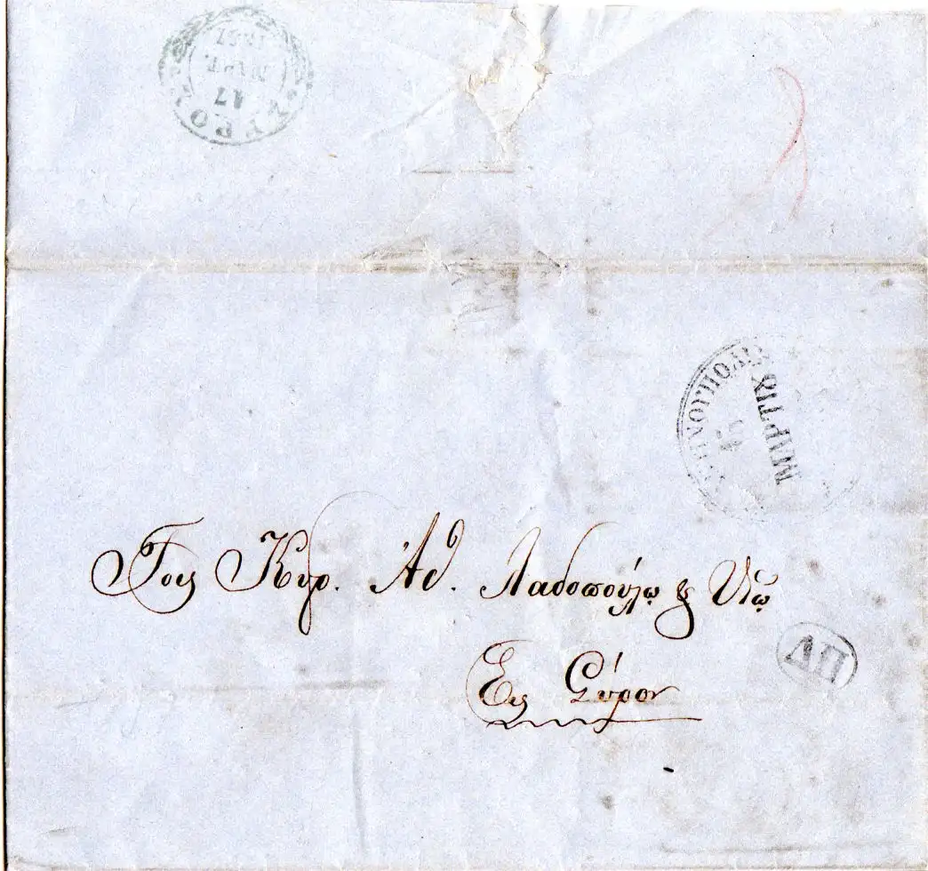 Griechenland Post i.d. Türkei1857, K2 Konstantinopolis u. PD auf Brief n. Syros