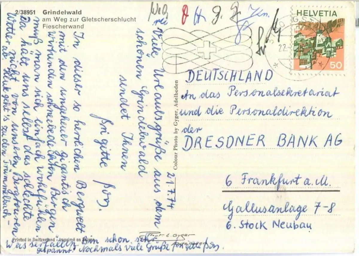Grindelwald am Weg zur Gletscherschlucht - Fiescherwand - Verlag Gyger Adelboden - leichte Gebrauchsspuren (E90526) gel. 1974