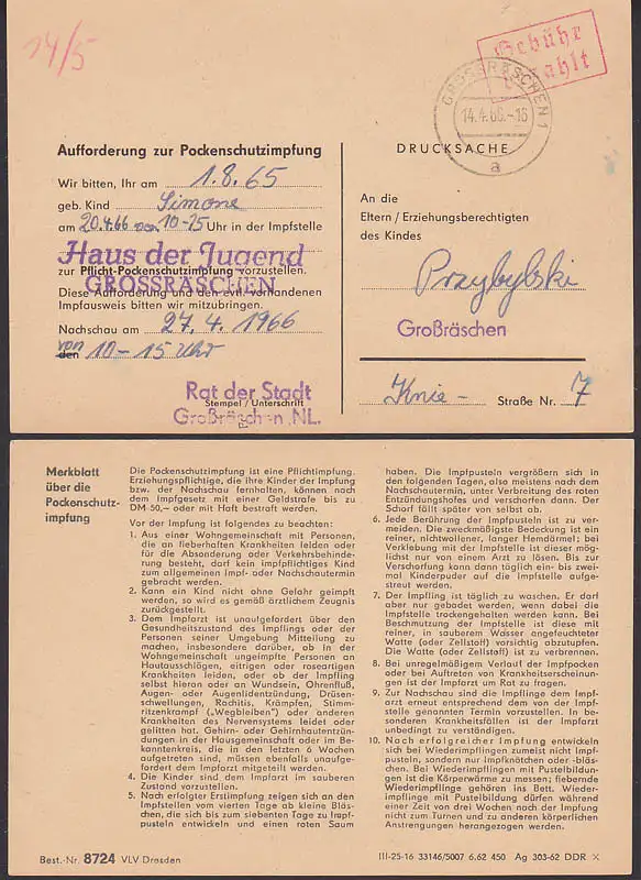 Groár„schen Vodruckkarte Aufforderung zur Pockenimpfung, 14.4.66 Ds An die Eltern / Erziehungsberechtigten