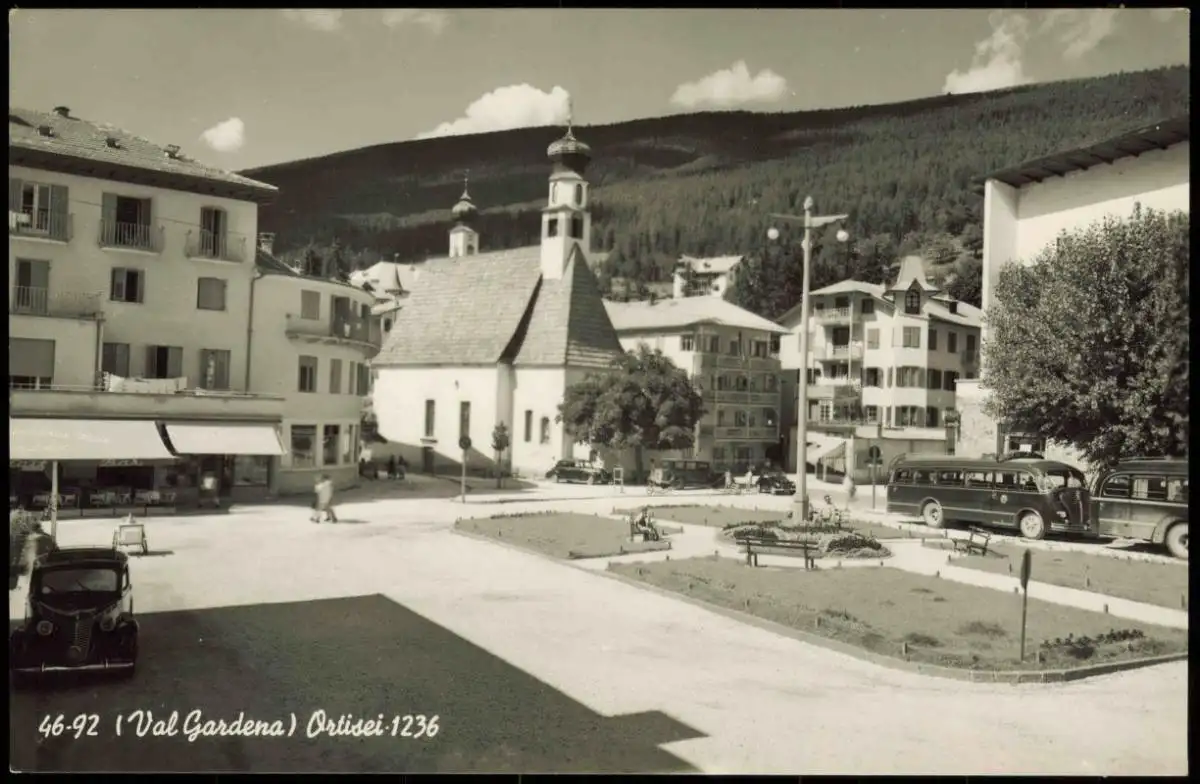 Gröden (Südtirol) Val Gardena Ortsansicht Val Gardena Ortisei, Auto, Bus 1950