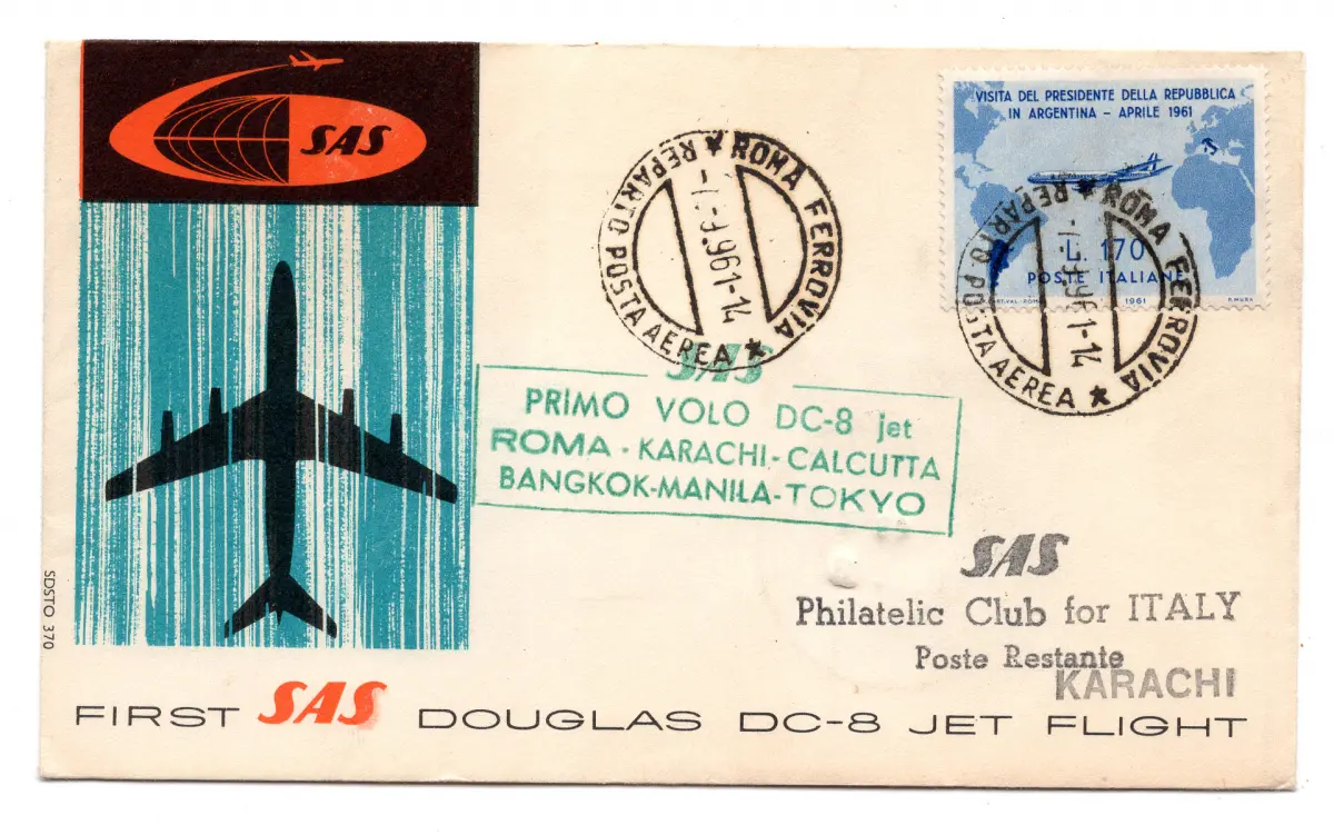 Gronchi Lire 170 isoliert auf Aerogramm nach Karatschi weitergeleitet mit dem I. Flug SAS - Gronchi Lire 170 Nr. 918 isoliert auf Airbrush nach Karatschi am 7.9.61 weitergeleitet mit dem I. Flug SAS ab Rom - neben der Ann. Sonderflug - Ungewöhnlich im Tarif Nr. 634/20
