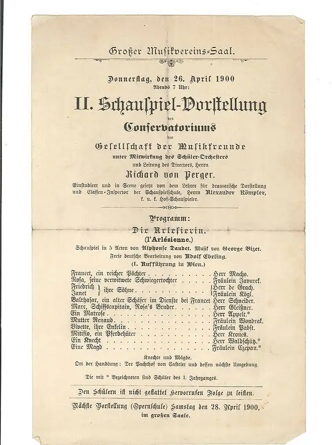 Bemerkungen: Veranstaltungsplakat der "Gesellschaft der Musikfreunde" anlässlich einer Aufführung des "Conservatoriums der Gesellschaft der Musikfreunde". "Den Schülern ist nicht gestattet Hervorrufen Folge zu leisten".