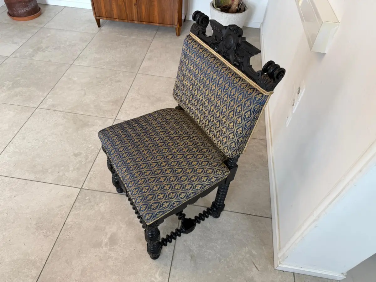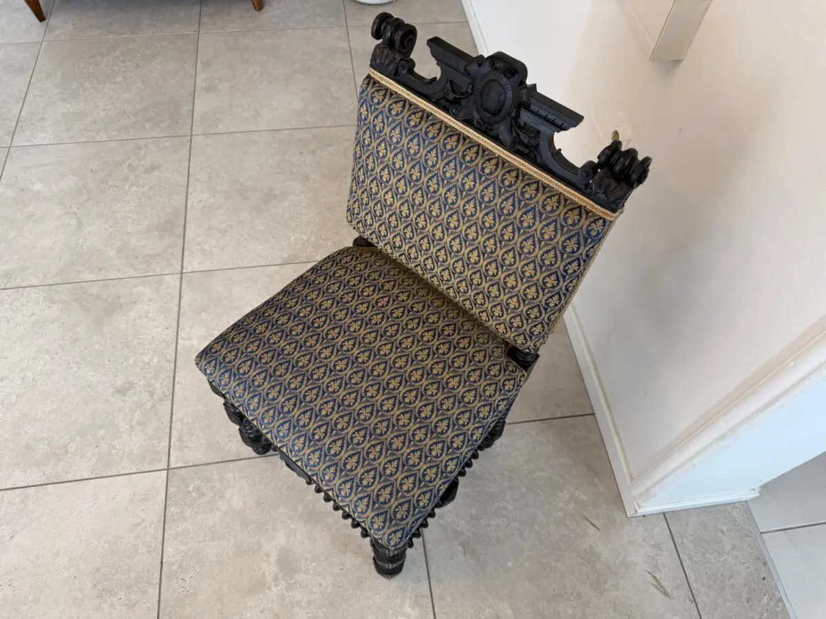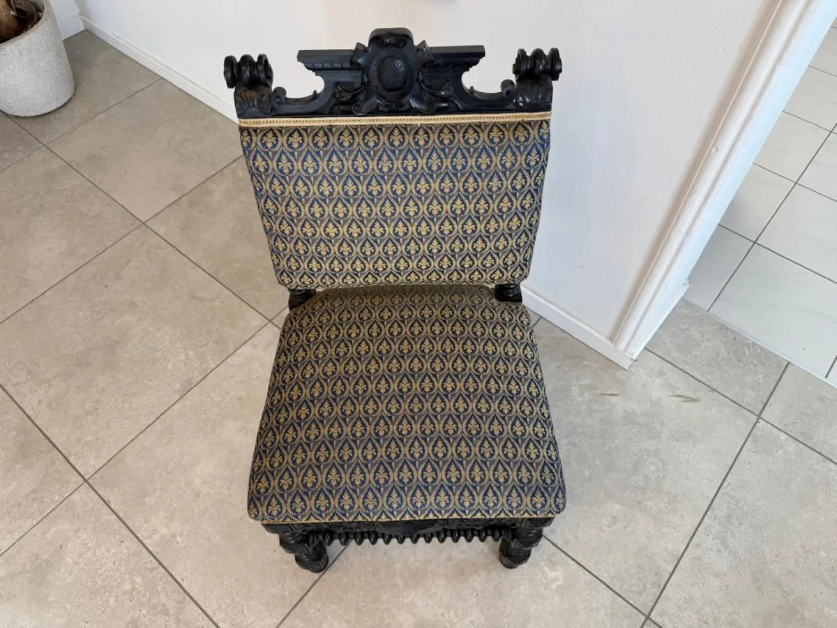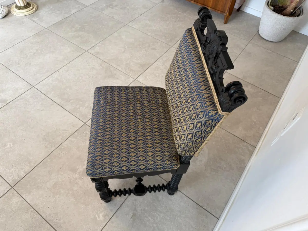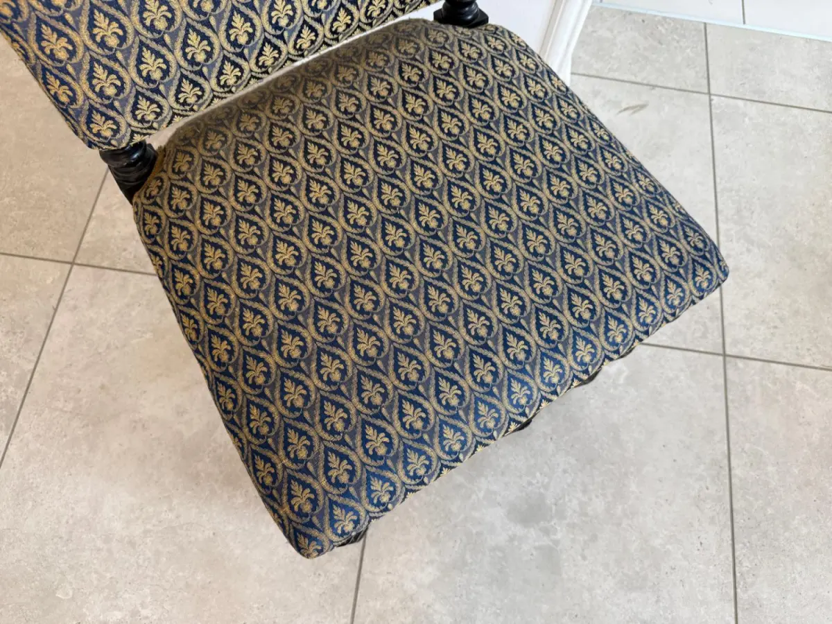 Die Polsterung von Sitzfläche und Rückenlehne ist in einem stilvollen, blau-gold gemusterten Stoff gehalten – sehr gepflegt und gut erhalten.