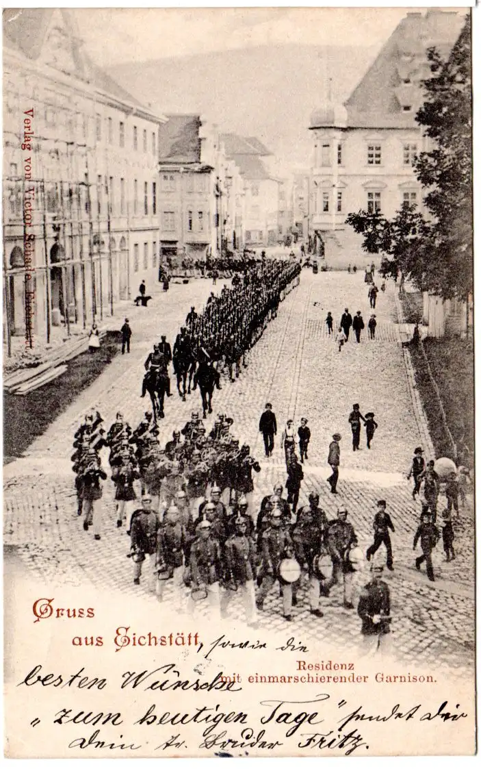 Gruss aus Eichstädt m. einmarschierender Garnision, 1899 gebr. sw-AK