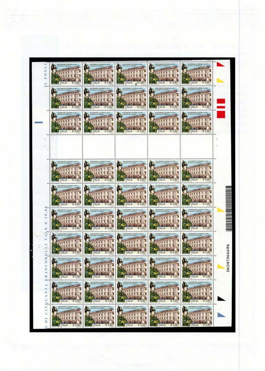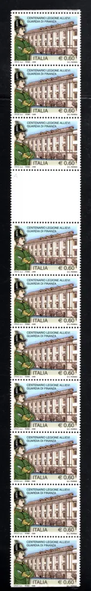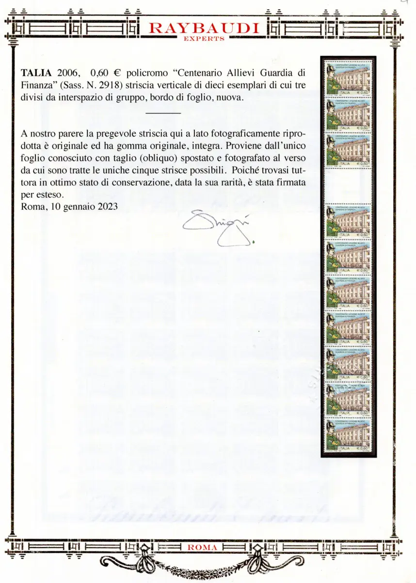 MNH - Vollgummi - - Guardia di Finanza Euro 0,60 Nr. 2918 vertikaler Streifen von zehn Exemplaren, davon drei durch Gruppenzwischenräume unterteilt (Kat. Einheitliche Nr. 2963 n. Chr.) - stammt aus dem einzigen bekannten Bogen mit Schrägschnitt - Selten, 5 vorhanden aus dem einzigen Blatt - Cert. Ray. gold - Kat. euro 1.500 Cod.805/182