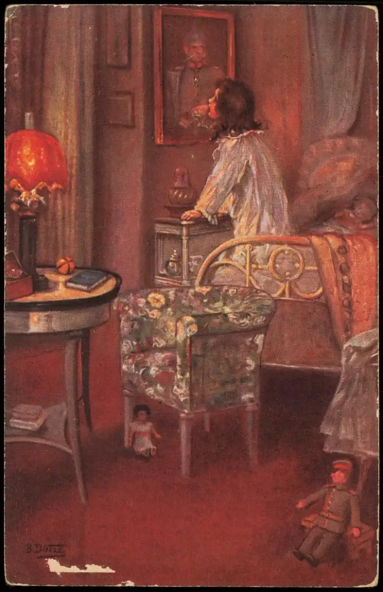 Gute Nacht, Väterchen! Mädchen Bild des Vaters Kinder Künstlerkarte 1915