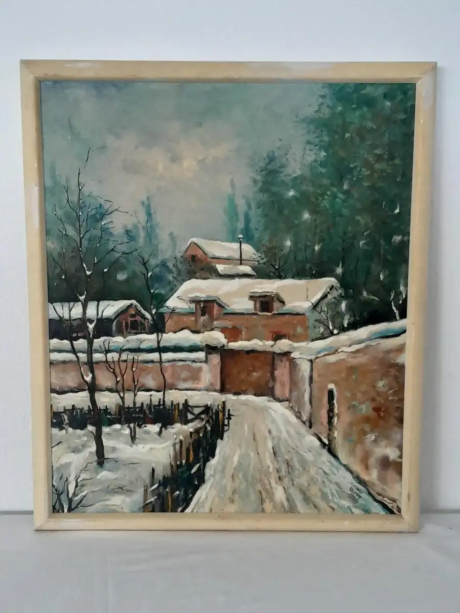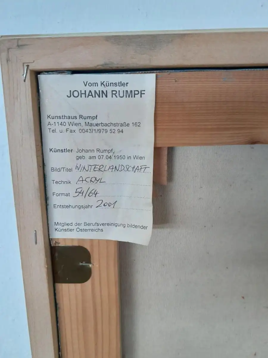Ein traumhaftes Gemälde, Öl auf Leinen, Motiv "Winterlandschaft - Johann Rumpf", gerahmt, datiert 2001, Rahmen vergilbt die Bilder sind Teil der Beschreibung und sprechen für sich. \n\nMaße: ca. 54,5 cm breit ca. 64,5 cm hoch ca. 3 cm Rahmen \n\nArtikelnummer: H1257 H6